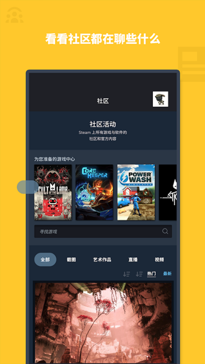 steam手机应用是一款非常热门的手机软件,有了该软件后不论你身在何处,任何时间都能参与到Steam社区中,了解到最新的游戏资讯,找到最新最好玩的游戏,为游戏爱好者们提供了巨大的方便。同时软件还支持在线查询到自己的游戏库资源内容,和你的好友直接在线聊天互动等,可以在线低价入手极品端游,购买交互各种道具,查询个人资料、解锁全新成就等,功能十分丰富,轻松满足了大家的不同软件需求。