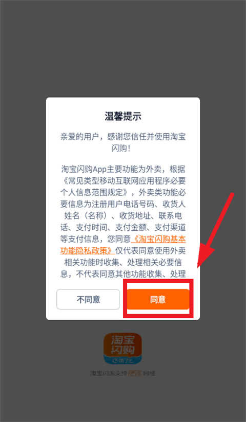 打开淘宝闪购app,先同意温馨提示