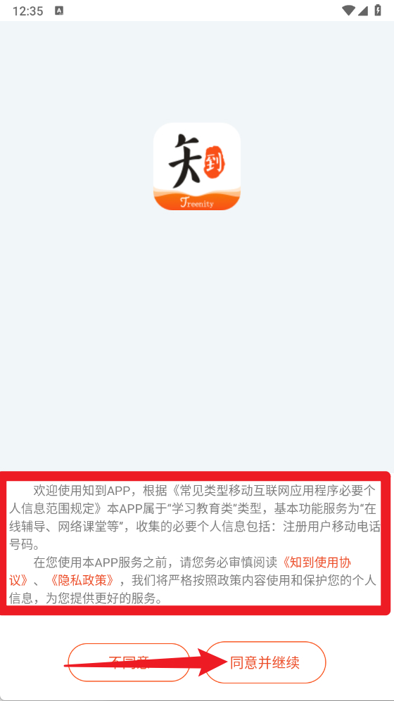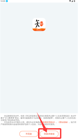 1、首次进入知到应用时,会出现隐私政策与用户协议确认页面,用户需认真阅读并点击“同意并继续”按钮后方可进入。