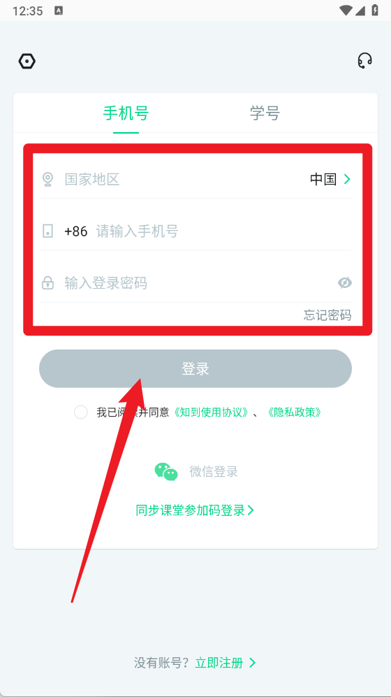 2、在登录页面,用户可以选择通过手机号或学号进行登录,需输入相关信息并勾选同意协议后点击“登录”。