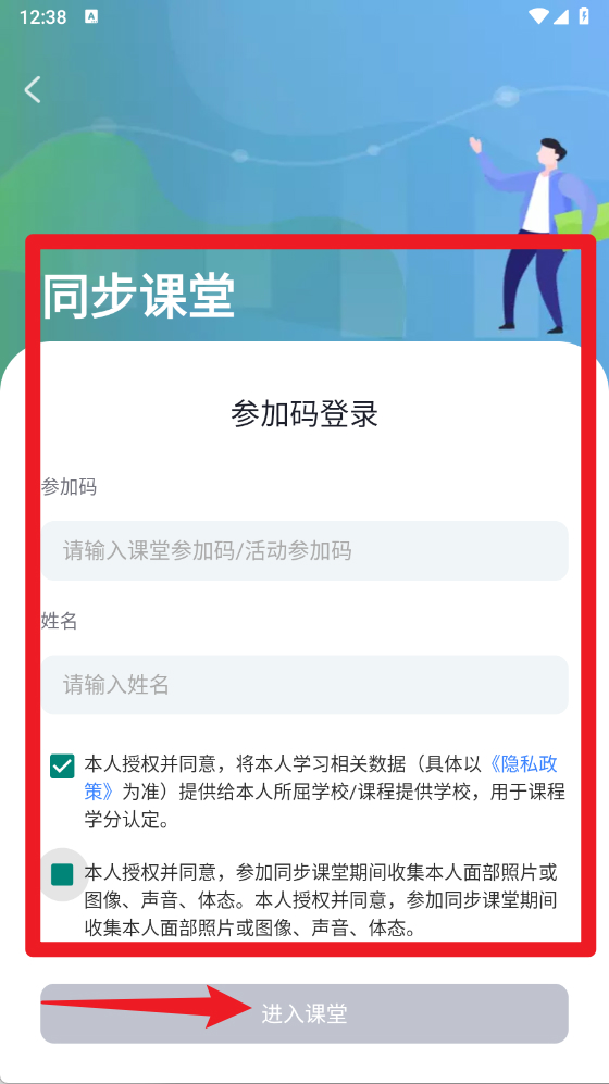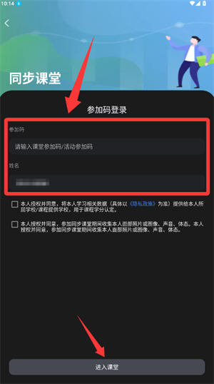 4、在“同步课堂”功能中,用户可通过输入参加码与姓名登录课堂,并同意授权学习数据采集,用于课程学分认证。