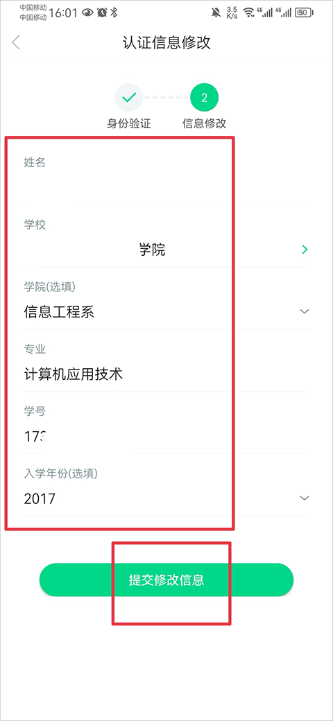 最后将正确的学校名称、学号等信息完善后点击提交修改信息即可