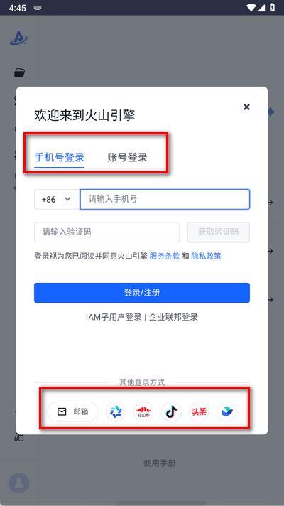 2、可使用手机号或者账号登录,也可使用抖音、邮箱等方式登录