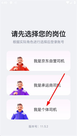 3、登录前需选择岗位类型,包含京东自营司机、承运商司机、个体司机三类,根据实际角色选择对应选项,之后可继续完成登录流程。