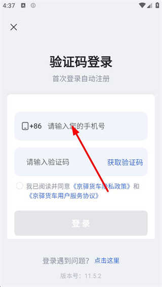2、登录界面选择验证码登录方式,输入手机号后获取并填写验证码,勾选同意相关协议,即可完成登录,首次登录会自动完成账号注册。