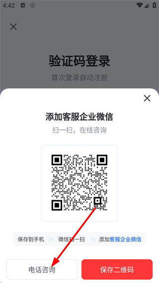 4、登录过程中若遇问题,可通过添加客服企业微信咨询,支持扫码、电话咨询等方式,也能保存二维码以便后续联系客服解决问题。