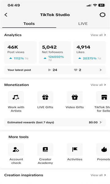 有些人即使符合5000粉的条件还是会出现没有开通带货橱窗的情况,比如有些人的Tiktok Studio进去以后是这样的
