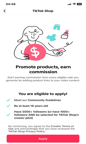 9、到这里点击Apply就可以申请开通达人带货橱窗了