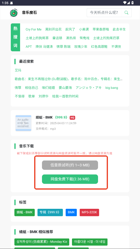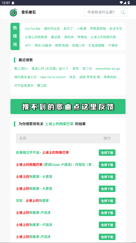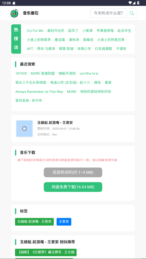 音乐魔石是一款集在线搜歌、试听与免费下载于一体的音乐应用,支持多平台音乐资源搜索,一键直达你想听的歌曲。界面简洁,操作便捷,支持高音质播放与批量下载,满足不同用户的听歌需求。无广告干扰,极速体验,让你轻松发现并收藏喜欢的音乐,是音乐爱好者必备的听歌神器。